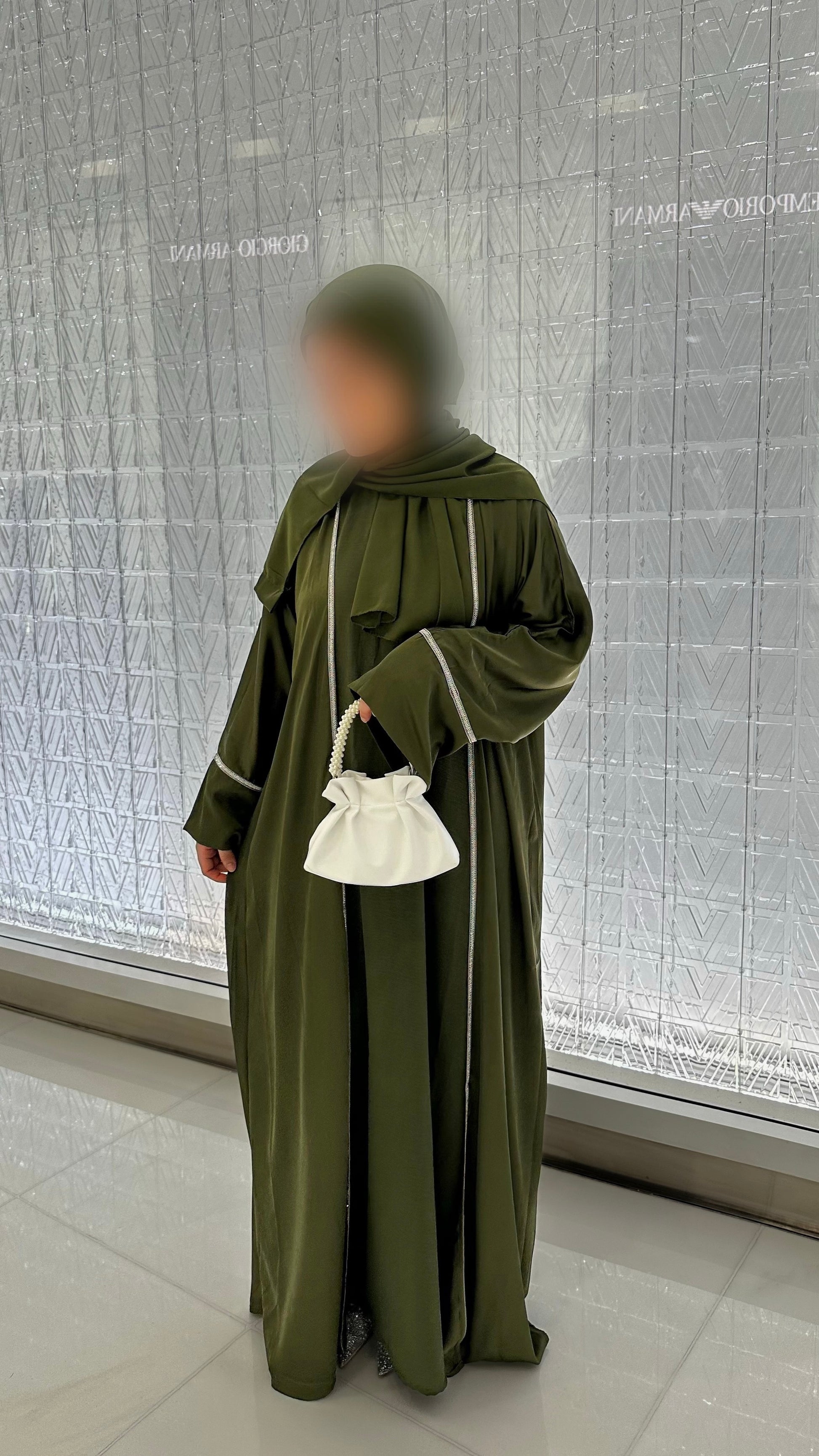 Inspirée par l’éclat et la magnificence des joyaux les plus précieux, l’Abaya Jawahir est une pièce qui incarne l’élégance pure. Confectionnée dans un tissu délicat et fluide, elle se distingue par ses strass scintillants délicatement placés le long des manches et de la ceinture, apportant à chaque mouvement une touche de lumière et de raffinement.